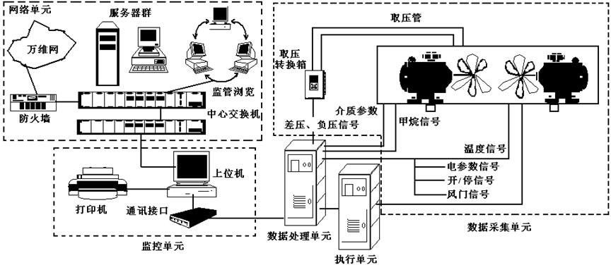TZJX系列煤礦主要通風(fēng)機(jī)在線監(jiān)測(cè)系統(tǒng)能根據(jù)風(fēng)量監(jiān)測(cè)裝置、瓦斯?jié)舛葯z測(cè)裝置、風(fēng)機(jī)故障檢測(cè)裝置采集到的風(fēng)量大小、瓦斯?jié)舛群凸收闲盘?hào)通過可編程控制器、工控機(jī)、變頻器、接觸器實(shí)時(shí)顯示通風(fēng)機(jī)的運(yùn)行狀況。當(dāng)運(yùn)轉(zhuǎn)的風(fēng)機(jī)出現(xiàn)故障時(shí),能停止故障風(fēng)機(jī),發(fā)出故障報(bào)警信號(hào)。需要切換備用通風(fēng)機(jī)時(shí),系統(tǒng)能自動(dòng)檢測(cè)備用風(fēng)機(jī)狀態(tài)并打印出審批報(bào)表,經(jīng)審批通過后可實(shí)現(xiàn)自動(dòng)或手動(dòng)切換。能對(duì)礦井總回風(fēng)巷的風(fēng)速進(jìn)行監(jiān)測(cè),在礦井需要反向送風(fēng)時(shí)能快速反向送風(fēng),確保礦山安全生產(chǎn)。